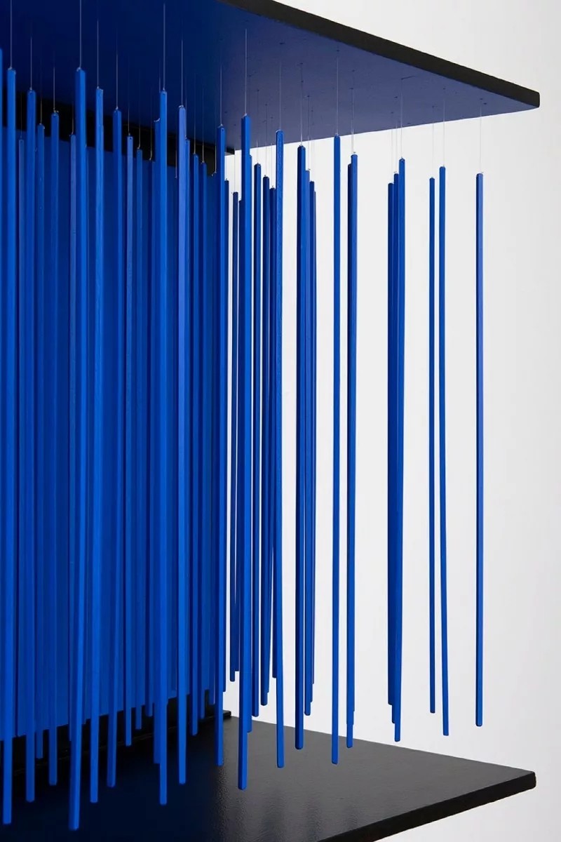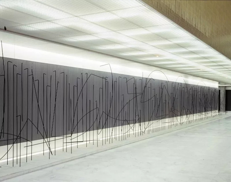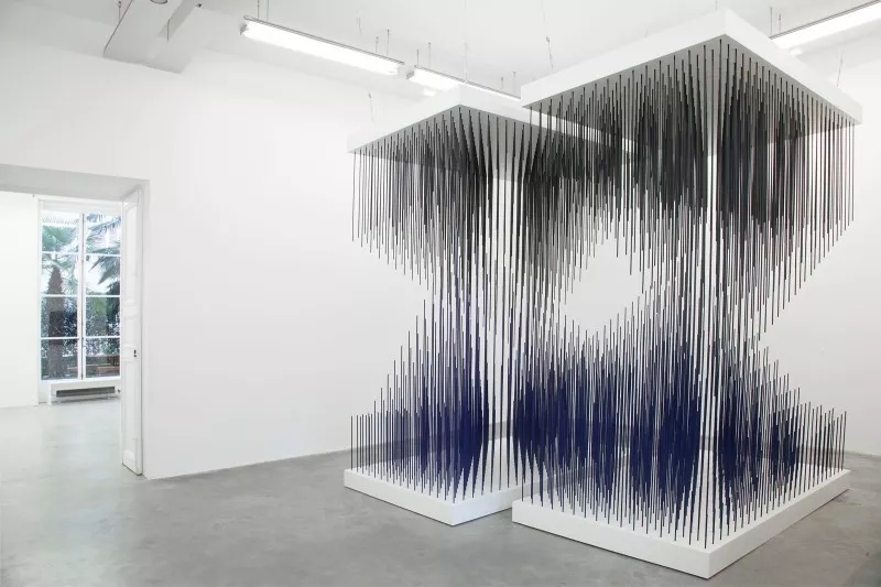 “活動雕塑”最早是杜尚在看了考爾德的抽象、依靠風力運動的雕塑時提出的。隨著科技的發(fā)展和人類對自身探索的不斷進步,20世紀中葉西方掀起了歐普藝術(shù)(optical art)。歐普藝術(shù)利用研究的幾何圖形和精心設(shè)計的色彩,造成視知覺運動感及閃爍感,色彩與形狀運動的視覺幻象。同時,金屬焊接技術(shù)在戰(zhàn)后城市建設(shè)中的大量運用,也給雕塑藝術(shù)家們提供了新媒材的選擇,他們將目光重新聚焦在現(xiàn)代生活的各個方面,尤其是工業(yè)技術(shù)領(lǐng)域。藝術(shù)家和公眾對于動態(tài)的作品的興趣濃厚,1955年,巴黎的德內(nèi)斯·和內(nèi)美術(shù)館舉辦了大型雕塑展覽,索托的作品亮相于國際重要的藝術(shù)活動。