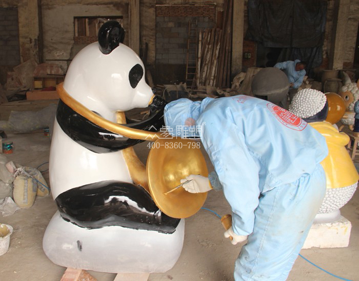 這組音樂題材的雕塑共三個雕塑,一位正在演奏的小提琴家,一位翩翩起舞的芭蕾舞女,和一只吹喇叭的大熊貓,其中小提琴家和芭蕾舞女雕塑 為真人大小,大熊貓雕塑高度為160CM,材質為玻璃鋼,工藝為噴漆彩繪。