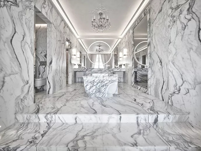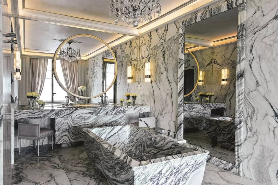 此外,拉格斐還用到了尼祿大理石(Nero Marquina)。這是西班牙最知名的裝飾性石材,通體呈深黑色,帶有白色紋理和不同形狀的灰色化石殘余。尼祿大理石主要用于室內,有時也被用在建筑物的外立面或室外人行道上。