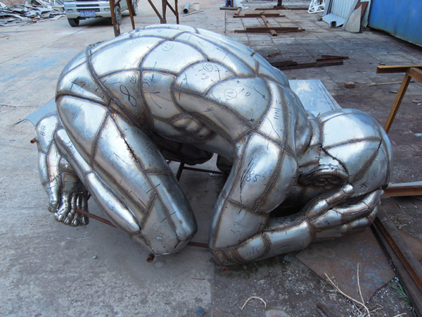不銹鋼雕塑這種反復的敲打需要足夠的時間和耐心,只有當每塊都可以比較好地與雕塑作品的某個區域吻合起來的時候,這道工序才算完成.所有表面的小塊都敲打定形之后,每個小塊之間通過焊接的方式連接起來,就形成了最終雕塑的外表面,看起來跟原來的作品基本一致。由于冷作的方式是通過敲打的方式來塑造作品的外表面的,所以比較適合表面不是特別復雜的雕塑作品。