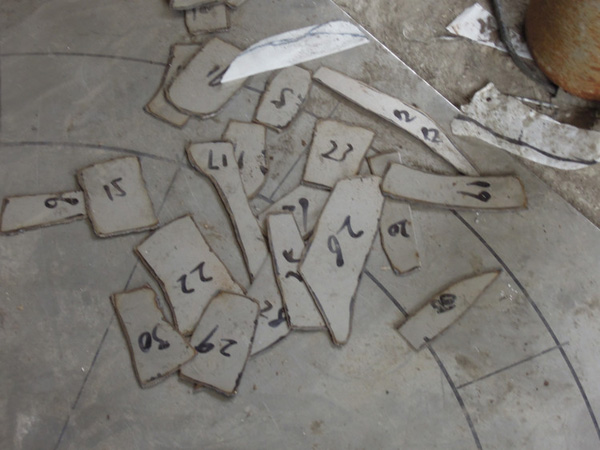 用玻璃鋼制作的模型強度會比較好,不用擔心像泥塑的模型那樣容易碰壞。采用冷作加工的方式時,工人們會將整個雕塑的外表面分割成很多個小塊,并且會對每個塊進行編號。用于不銹鋼冷作加工的原材料是事先做好的不同厚度的不銹鋼板,工人們需要在不銹鋼板上根據編好號的每一個小區域,畫出與之對應的形狀。由于不銹鋼板是平面的,而雕塑作品的表面是立體的,所以一是每個小塊的面積不能太大,另外每個小塊也需要留有一定的余地來方便之后的加工。